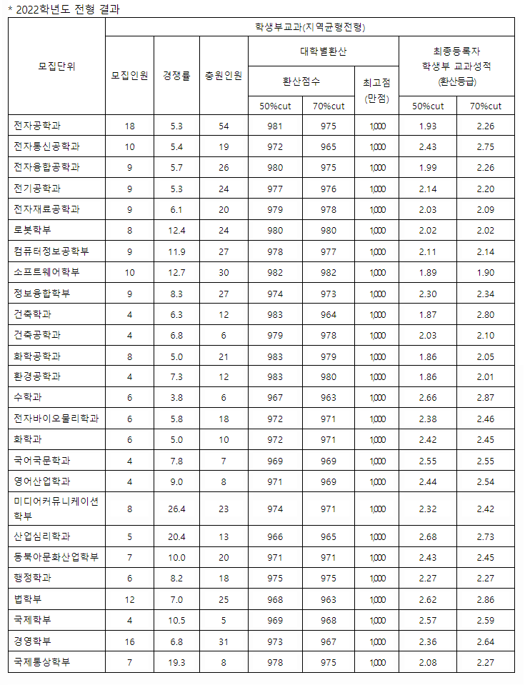 광운대학교 2022학년도 학생부 교과 지역균형전형 수시등급 50%컷 70%컷