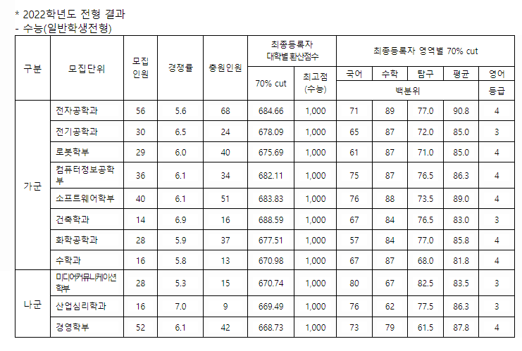 광운대학교 2022학년도 정시 가군, 나군 수능백분위 70%컷