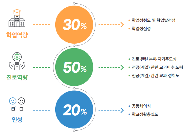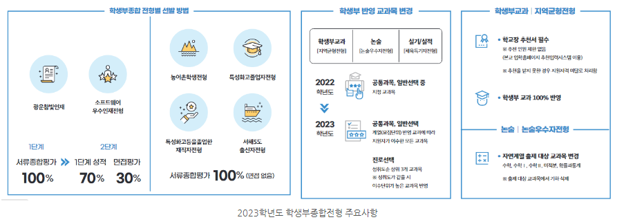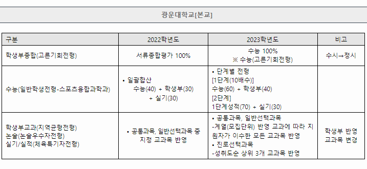 - 2023학년도 학생부종합전형 광운참빛인재전형 전형자료는 학교생활기록부, 자기소개서이며, 평가방법은 각 평가조별 입학사정관 2인 또는 3인으로 구성된 평가위원이 개별 독립평가, 지원자의 학교생활기록부, 자기소개서에 대한 종합적 정성평가, 평가 시 전형자료에 기재된 지원자 인적사항, 학교명 등 블라인드 처리, 서류종합평가 결과 우리 대학이 정한 일정기준 이상 편차가 발생하는 경우 재평가 실시
