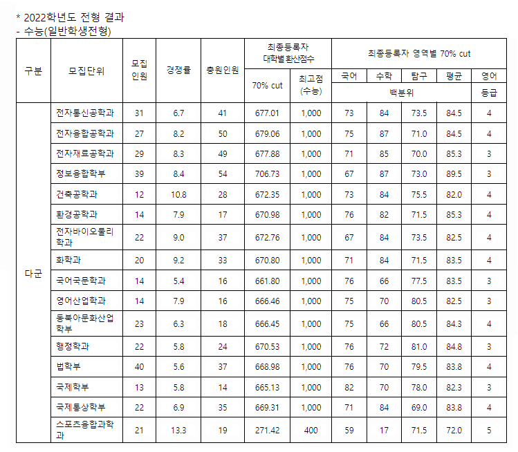 광운대학교 2022학년도 정시 다군 수능백분위 70%컷