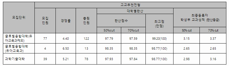 - 2023학년도부터 고른기회전형Ⅰ_ 국가보훈대상자 등이 학생부위주(종합)에서 학생부위주(교과)로 변경되어 2022학년도 학생부위주(종합)에서 비교 참고