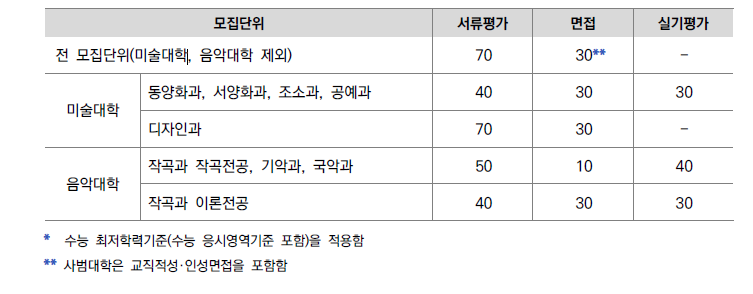 * 한하여 실기평가를 실시하고, 그 결과는 면접 및 구술고사에 반영함