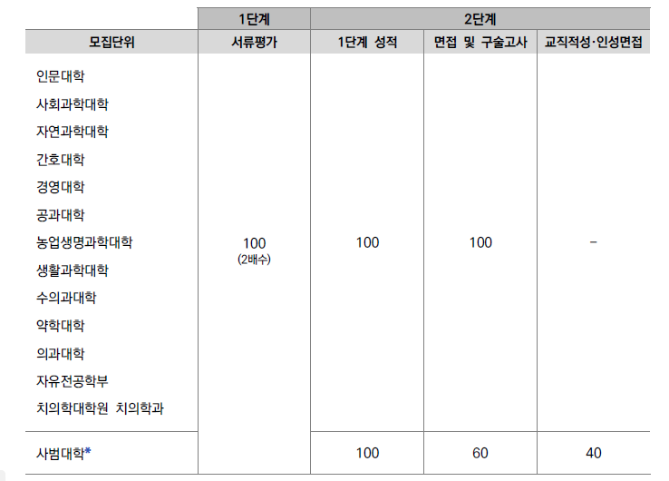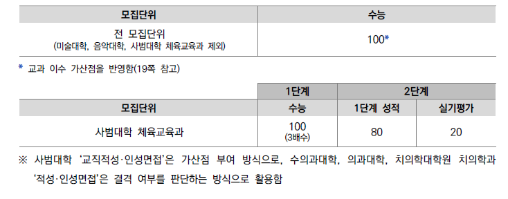 * 사범대학 체육교육과는 수능 최저학력기준(수능 응시영역기준 포함)을 적용하며, 1단계 합격자 중 단체종목 지원자에