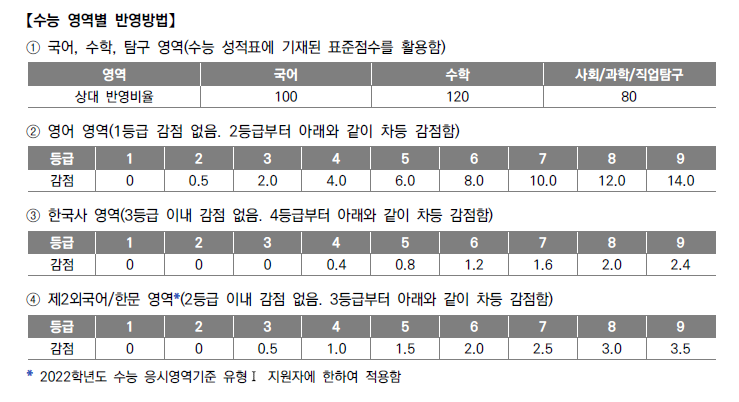 ▪ 위 전형으로 지원하는 자는 아래 ‘2022학년도 수능 응시영역기준’을 반드시 준수해야 함