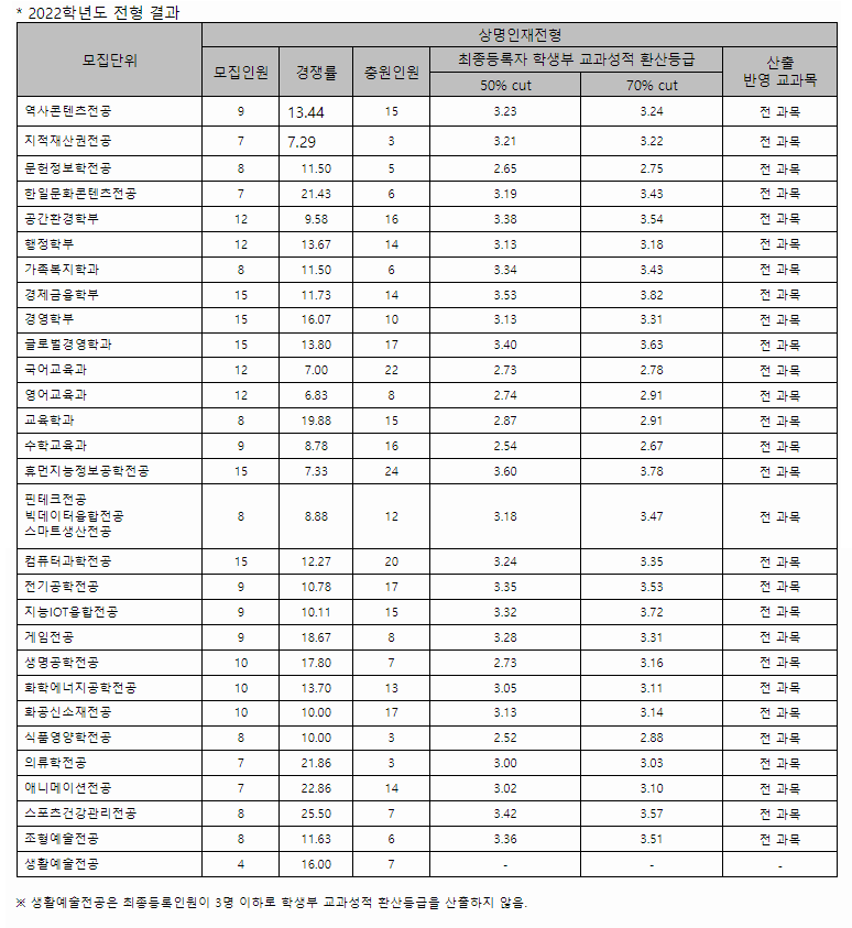 상명대학교 2022학년도 학생부종합 상명인재전형 등급컷