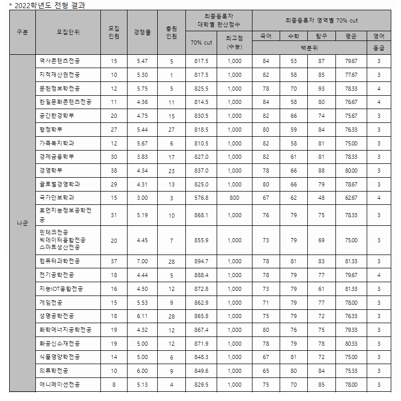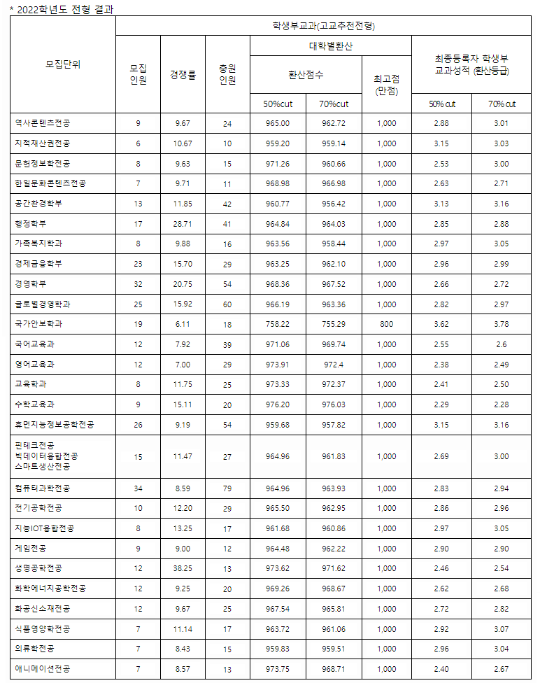 상명대학교 2022학년도 학생부교과 고교추천전형 등급컷