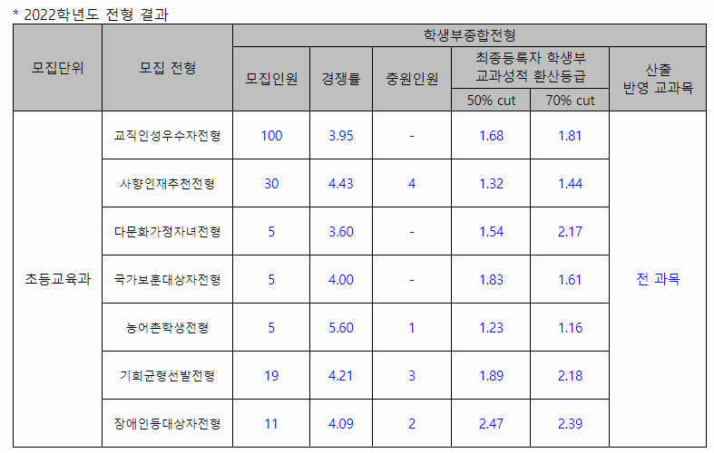 서울교육대학교 2022학년도 학생부종합(교직인성우수자전형) 수시등급 50%컷 70%컷