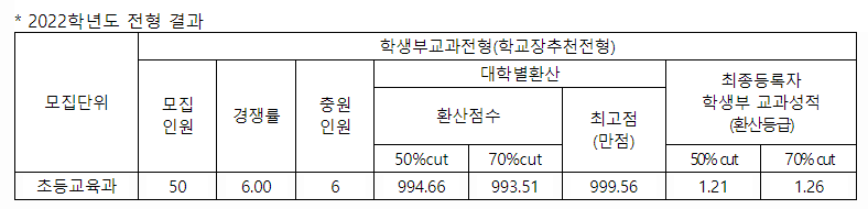 서울교육대학교 2022학년도 학생부교과(학교장추천전형) 수시등급 50%컷 70%컷