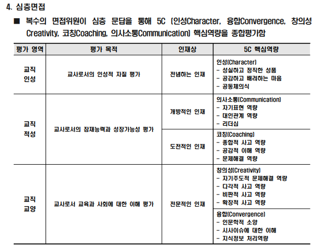 ■ 복수의 면접위원이 심층 문답을 통해 5C (인성Character, 융합Convergence, 창의성Creativity, 코칭Coaching, 의사소통Communication) 핵심역량을 종합평가함