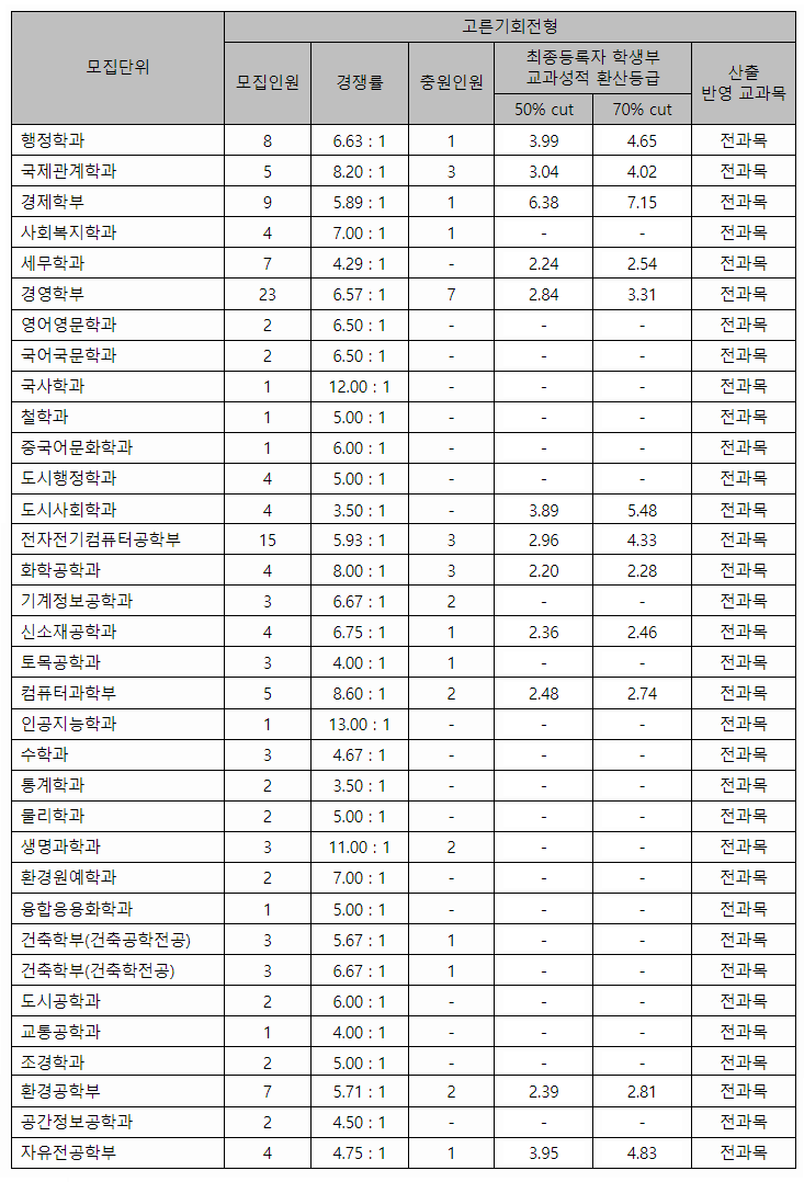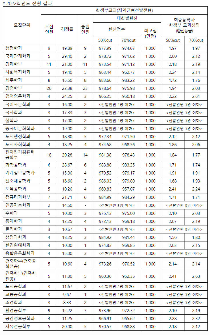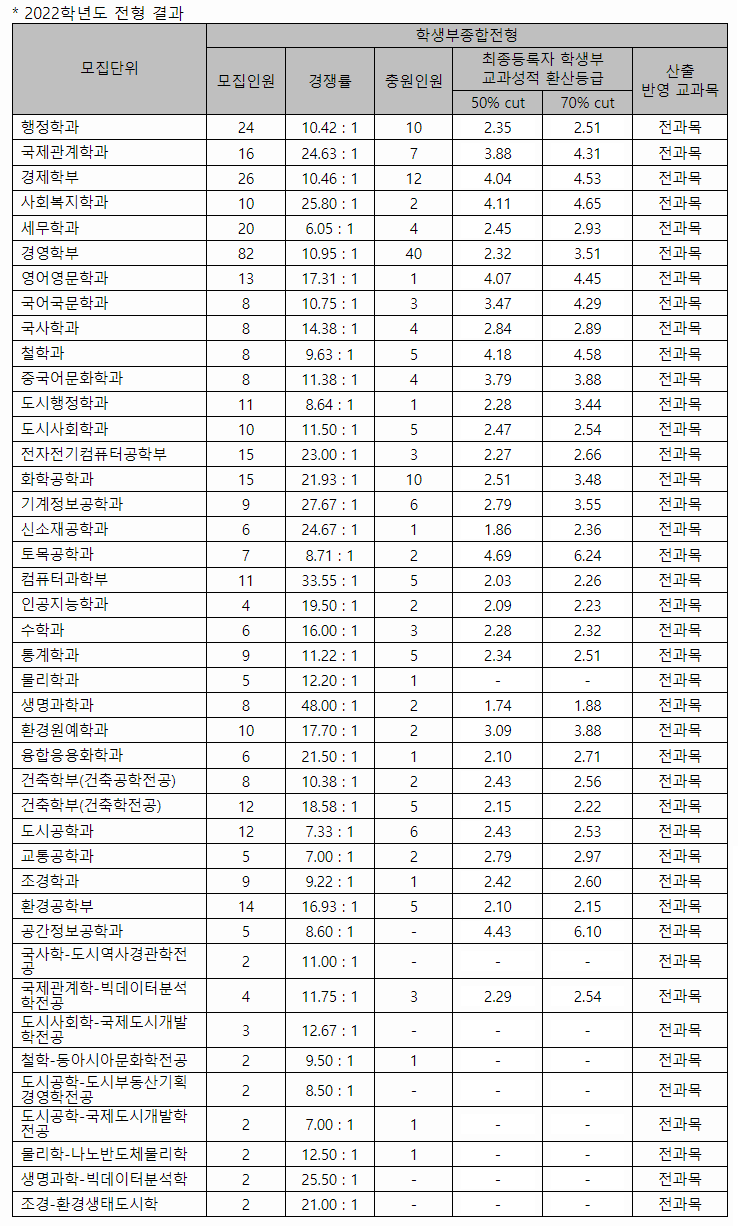 서울시립대학교 2022학년도 학생부교과 교과등급 50% 70%컷
