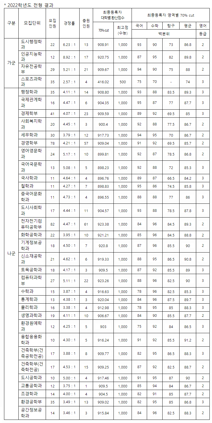 서울시립대학교 2022학년도 정시 수능 백분위 70%컷
