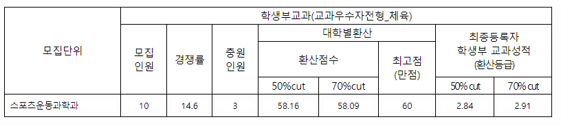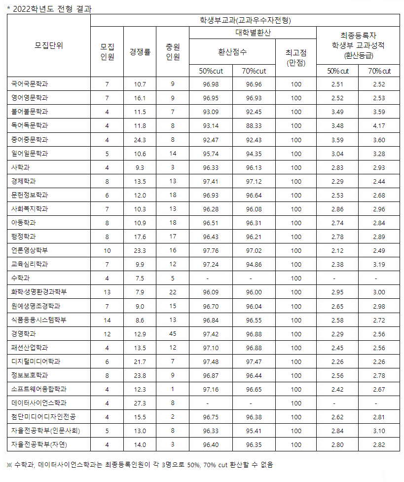 서울여자대학교 2022학년도 학생부교과(교과우수자전형)합격자 수시등급컷50%,7%