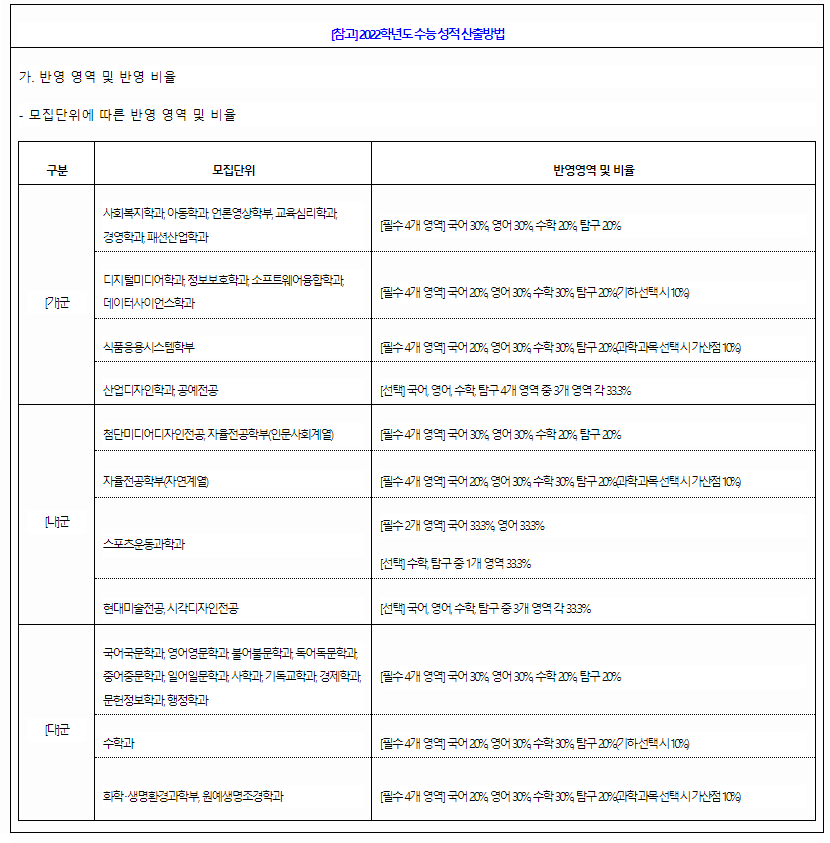 서울여자대학교 2022학년도 수능성적 산출방법