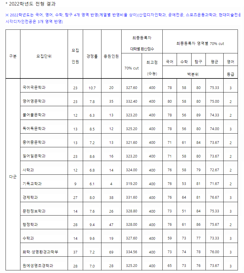 서울여자대학교 2022학년도 정시합격자 백분위 70%컷
