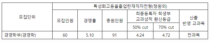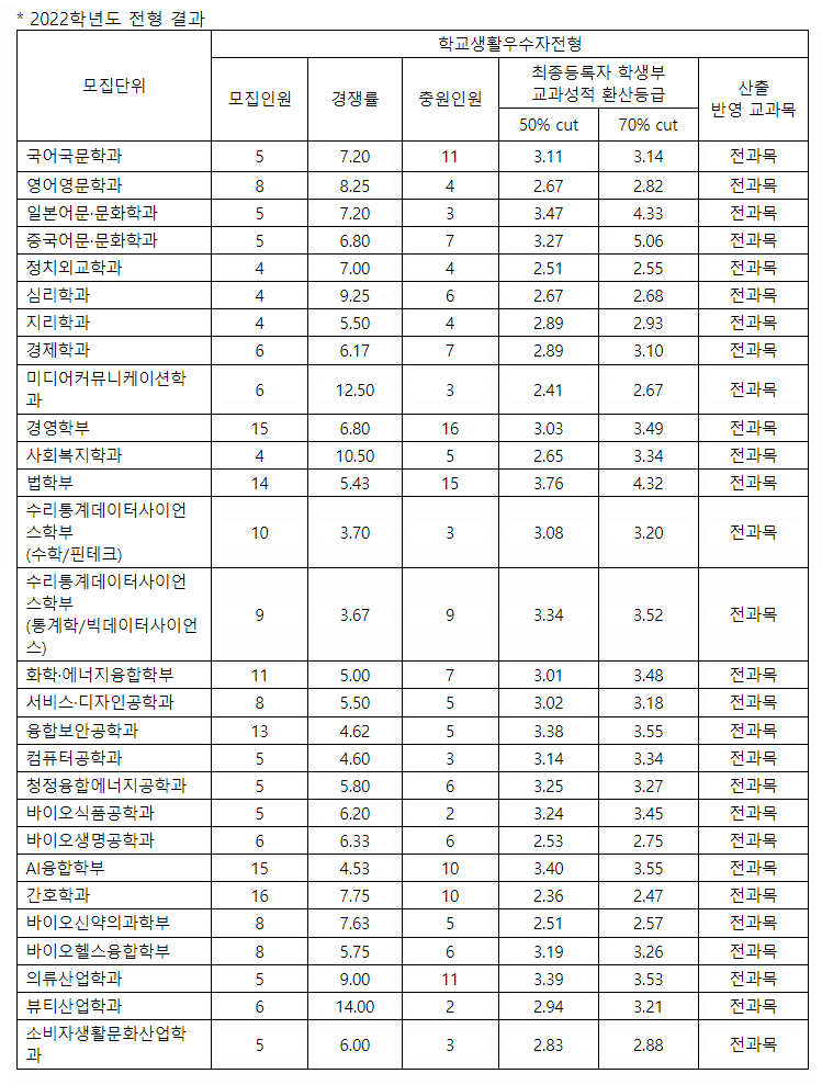 성신여자대학교 2022학년도 학생부교과전형 합격자 등급컷