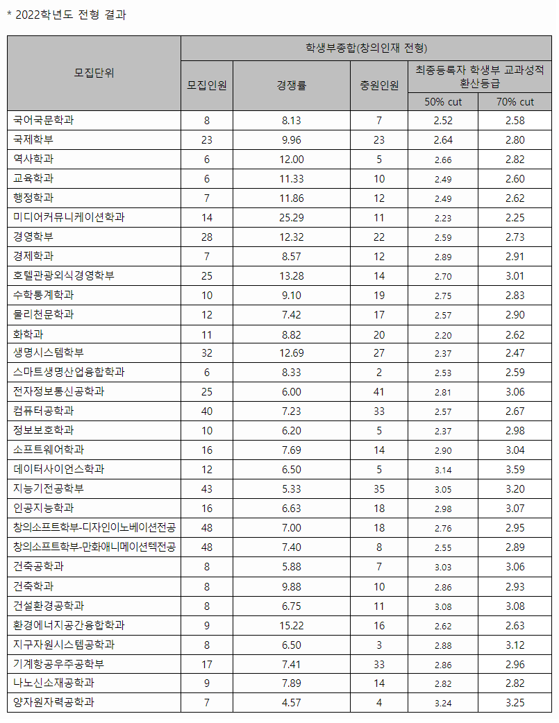 세종대학교 2022학년도 학생부종합 합격자 내신등급컷 50%컷, 70%컷