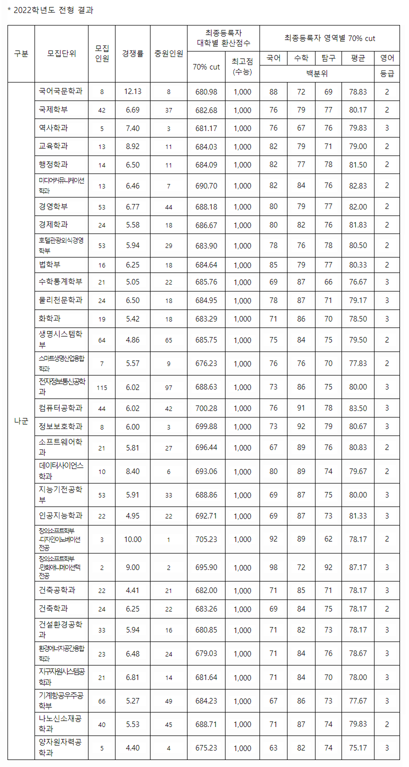 세종대학교 2022학년도 학생부교과전형 합격자 등급컷