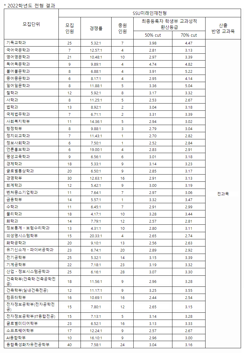 숭실대학교 2022학년도 학생부종합전형(SSU미래인재전형) 합격자 학생부등급 50%컷 70%컷
