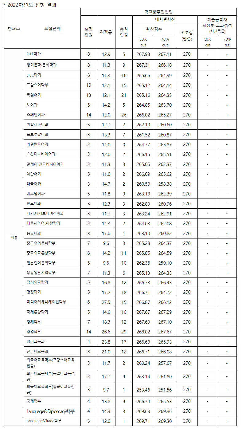 한국외국어대학교 2022학년도 학생부교과전형 합격자 학생부 환산점수 50%컷 70%컷