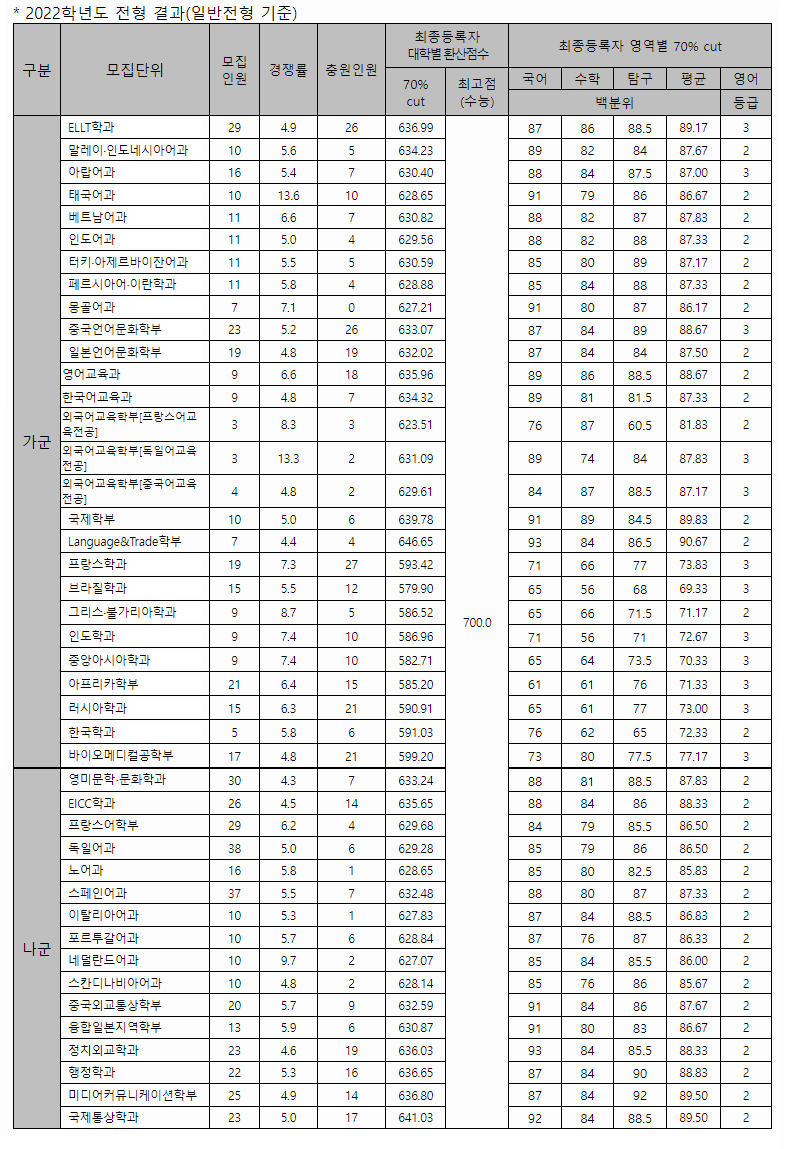 한국외국어대학교 2022학년도 입시결과 수시등급컷 정시백분위컷
