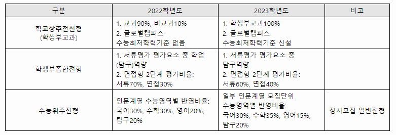 한국외국어대학교 2023학년도 주요 변경사항