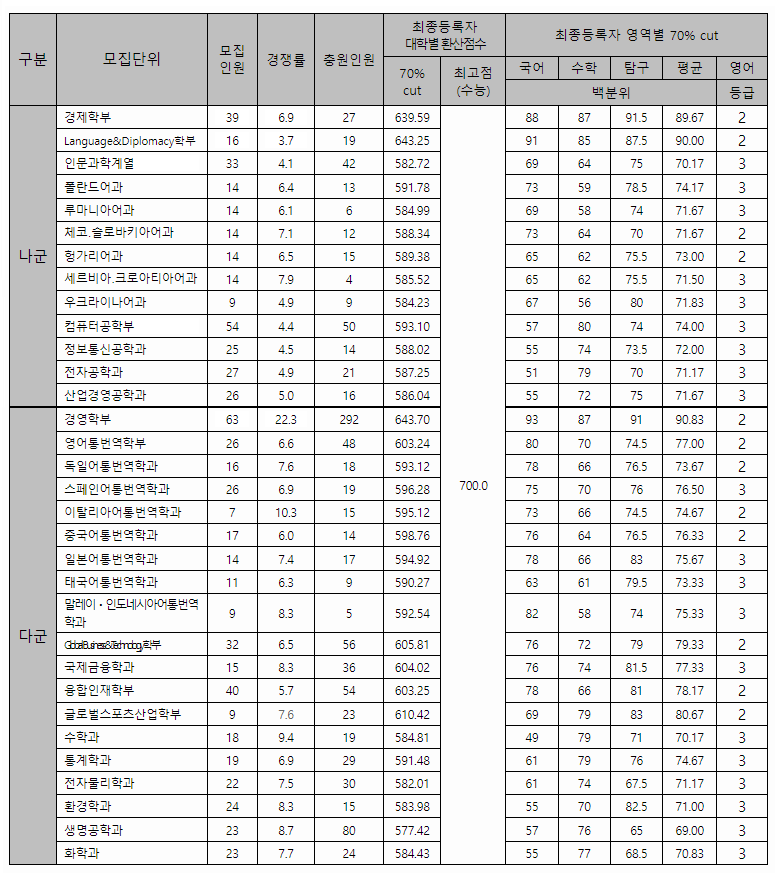 한국외국어대학교 2022학년도 정시 백분위 컷
