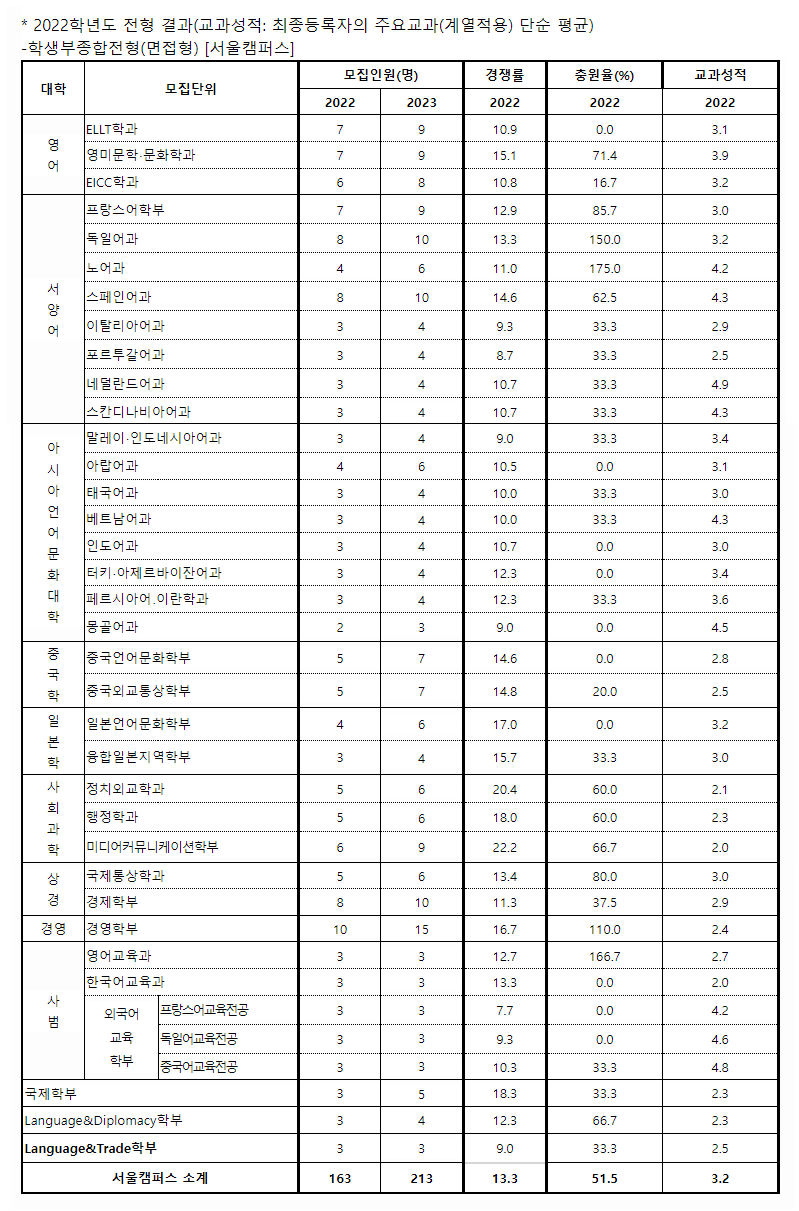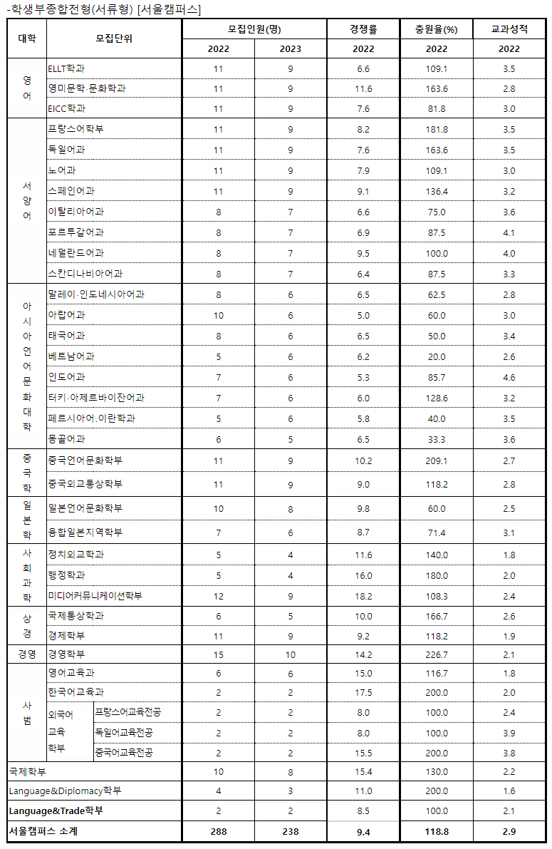 한국외국어대학교 2022학년도 학생부종합전형 합격자 내신등급평균컷