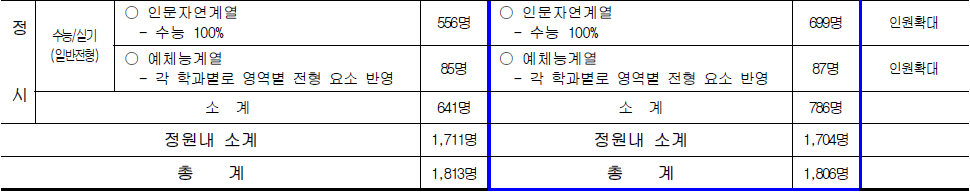 ※ 융합전공학부의 경우, 수시모집 미충원인원이 발생하여, 이월인원을 정시모집으로 선발 시 인문계열 모집단위는 인문계열Ⅰ, 자연계열 모집단위는 주관 모집단위의 수능 반영방법을 따름. (물리학-나노반도체물리학, 생명과학-빅데이터분석학전공 : 자연계열Ⅰ, 도시공학-도시부동산기획경영학전공, 도시공학-국제도시개발학전공, 조경-환경생태도시학전공 : 자연계열Ⅱ)