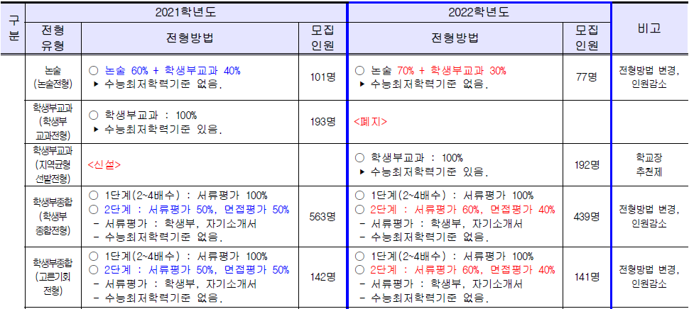 서울시립대 2021학년도 대비 2022학년도 입학전형 주요 변경사항