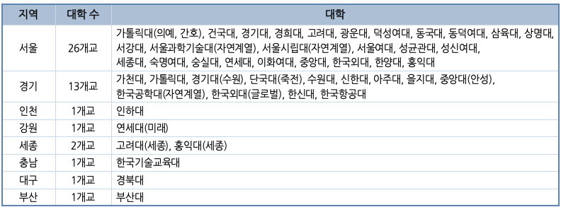 서울지역 26개교 경기지역 13개교 인천지역 1개교 강원지역 1개교 세종지역 2개교 충남지역 1개교 대구지역 1개교 부산지역 1개교