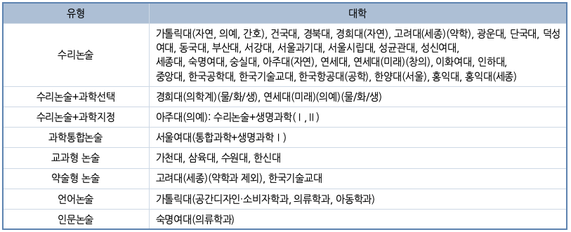 100% 논술전형 대학교: 가천대, 건국대, 경희대, 고려대, 고려대(세종), 덕성여대, 동덕여대, 성균관대, 연세대, 연세대(미래), 이화여대, 한국기술교육대, 한국외대, 한국항공대