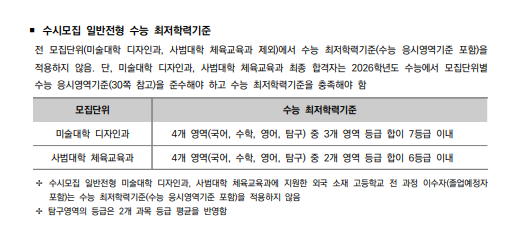 - 미술대학 디자인과: 국, 수, 영, 탐 중 3개 영역 등급 합 7등급 이내