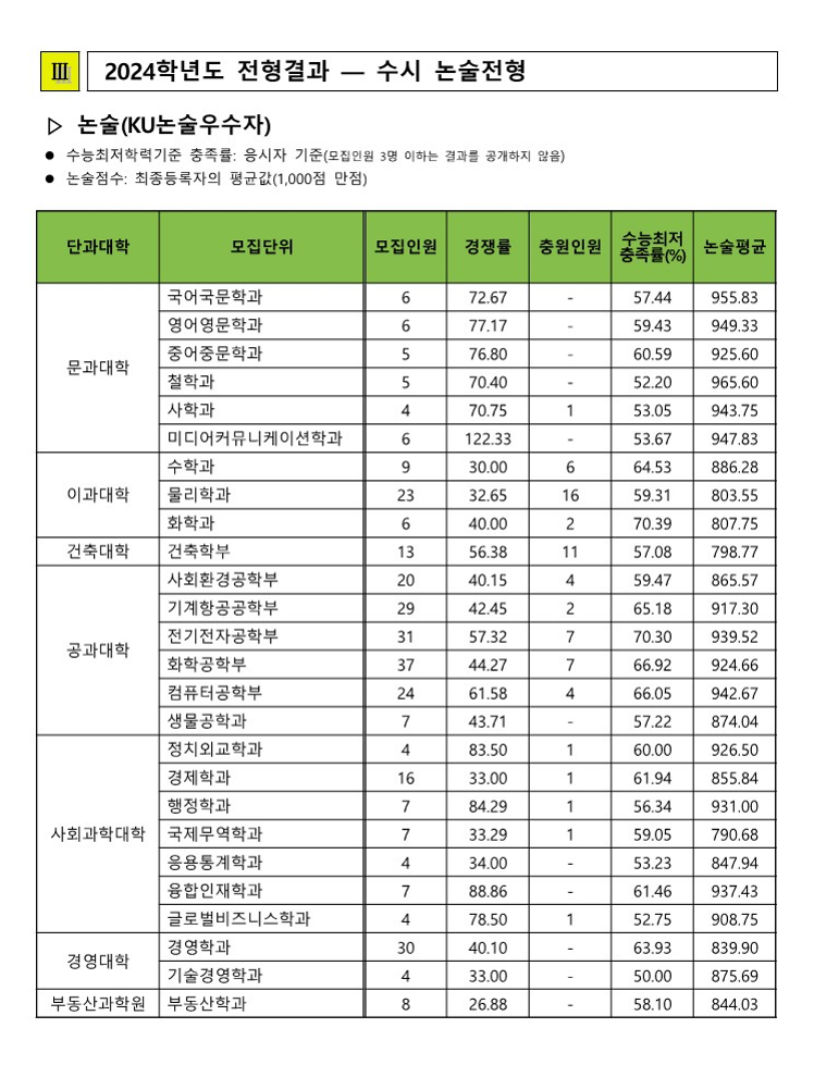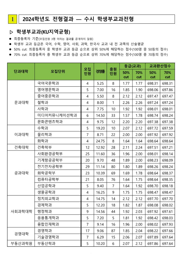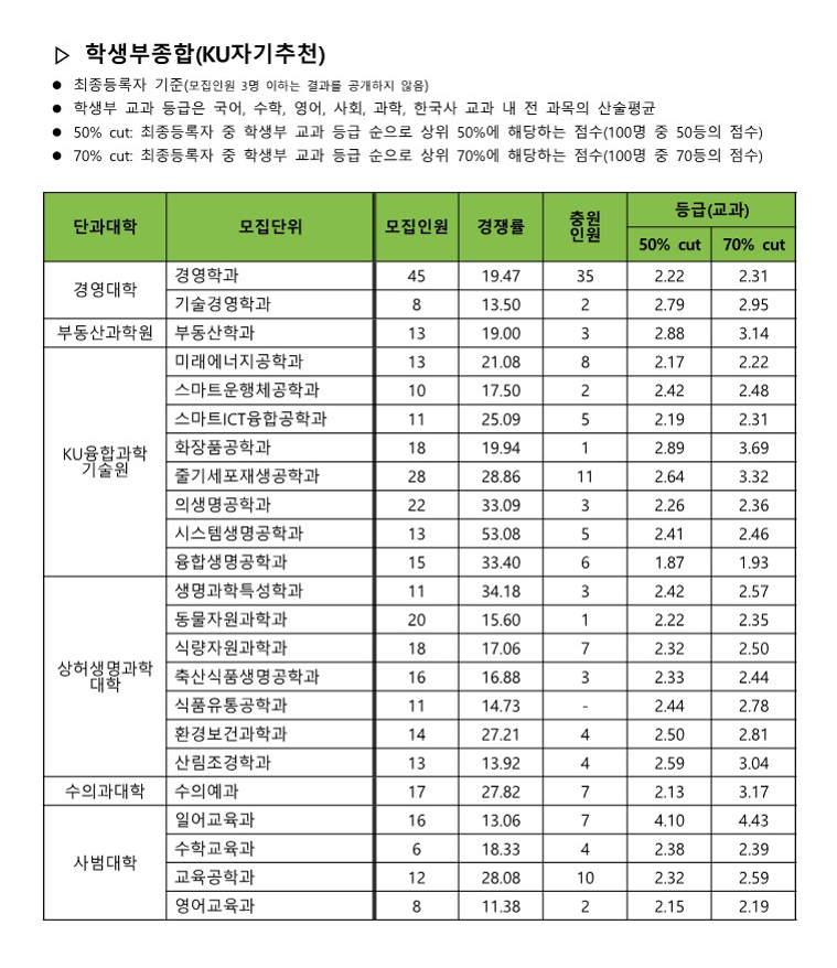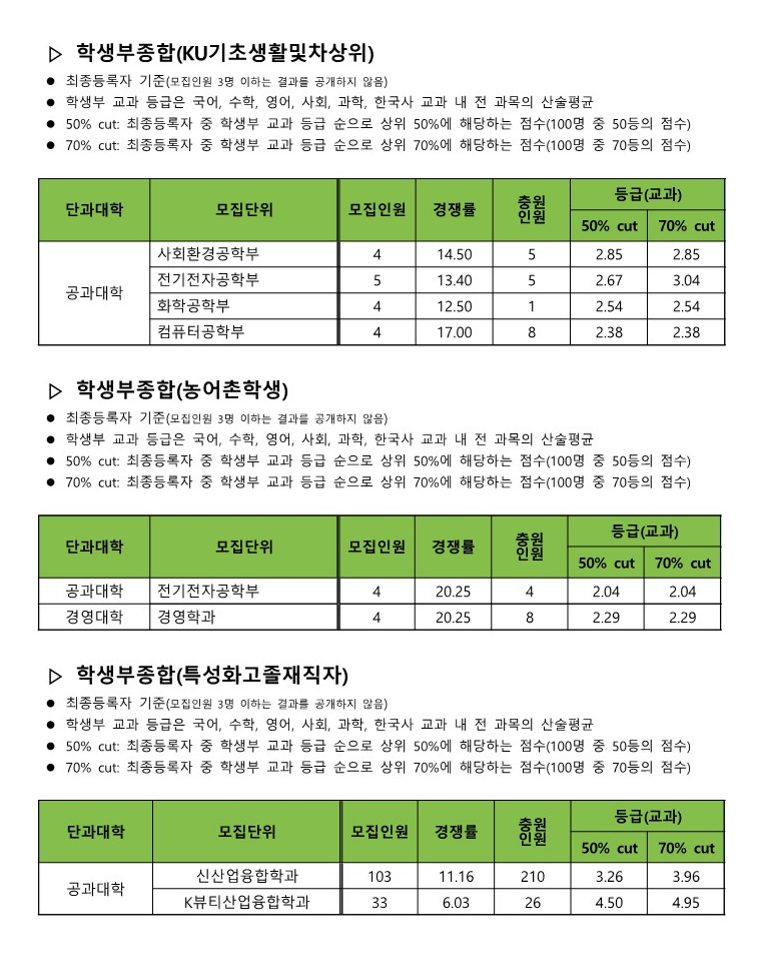 수능(KU 일반전형) 합격자 수능 등급컷 및 교과환산점수