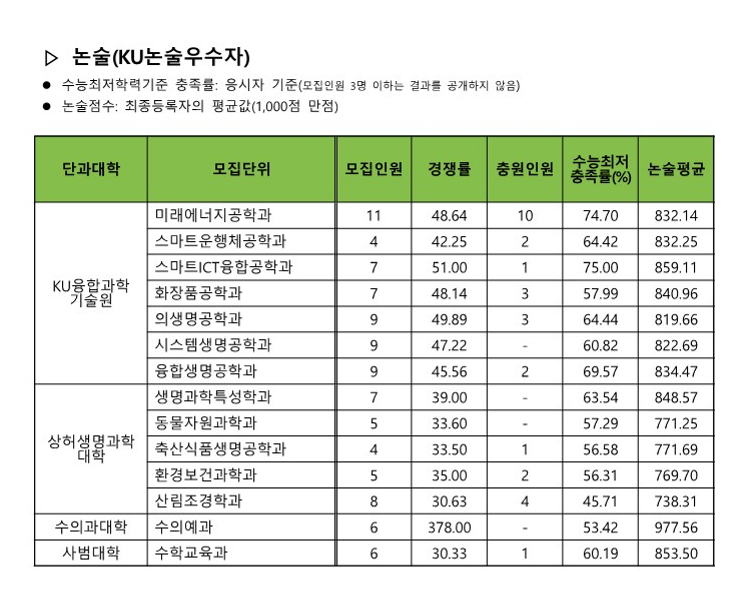 논술(KU 논술우수자)합격자 등급컷 및 교과환산점수