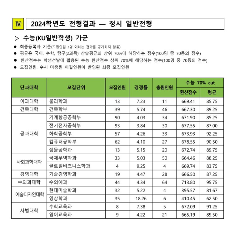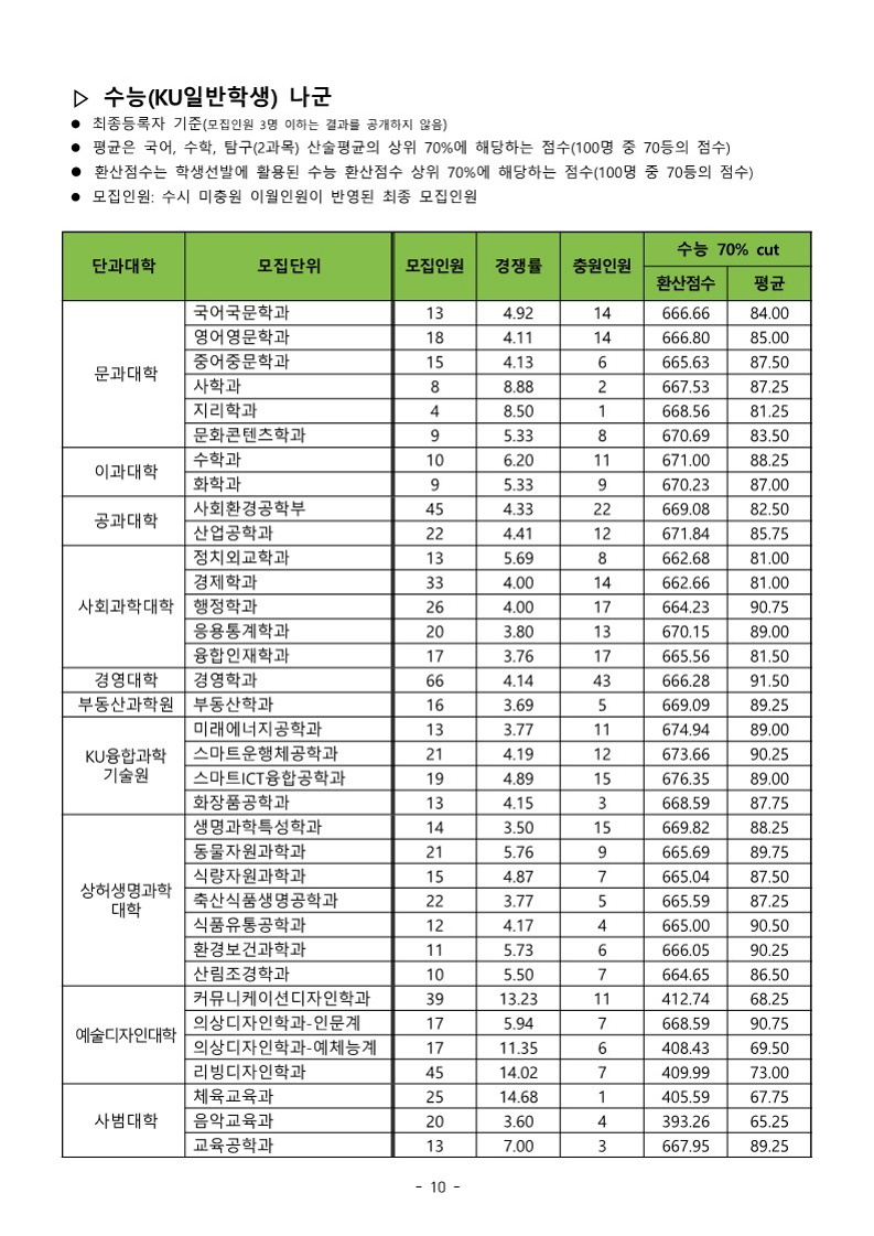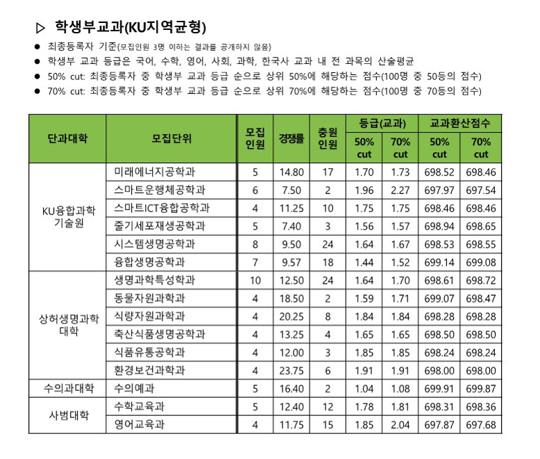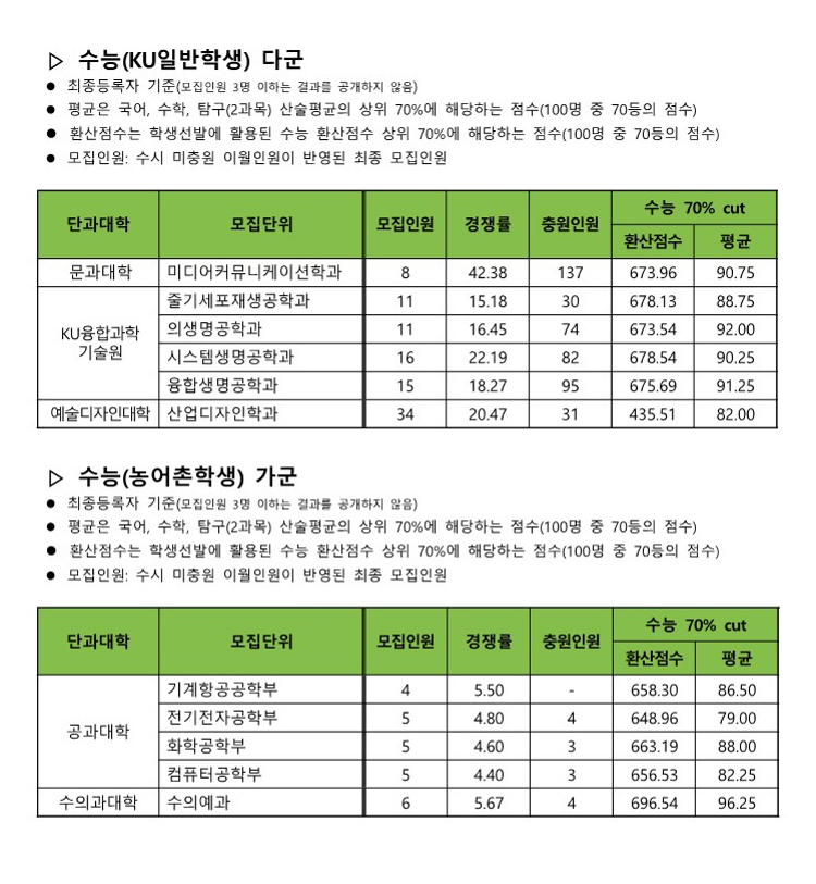수능(KU 일반전형) 합격자 수능 등급컷 및 교과환산점수