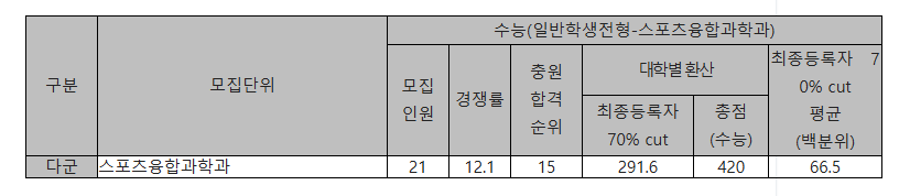 광운대학교 2024학년도 수능 스포츠융합과학과 백분위 70% 컷