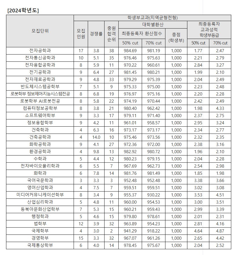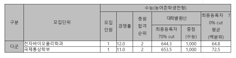 광운대학교 2024학년도 수능 농어촌학생전형 백분위 70% 컷