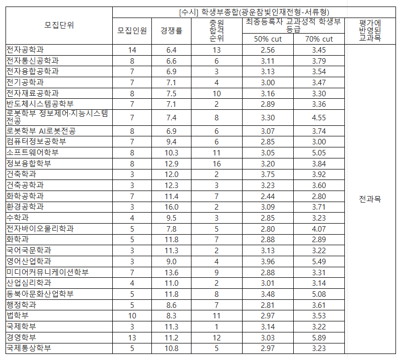 2024학년도 광운대학교 학생부종합 광운참빛인재전형- 서류형 50%컷 70%컷