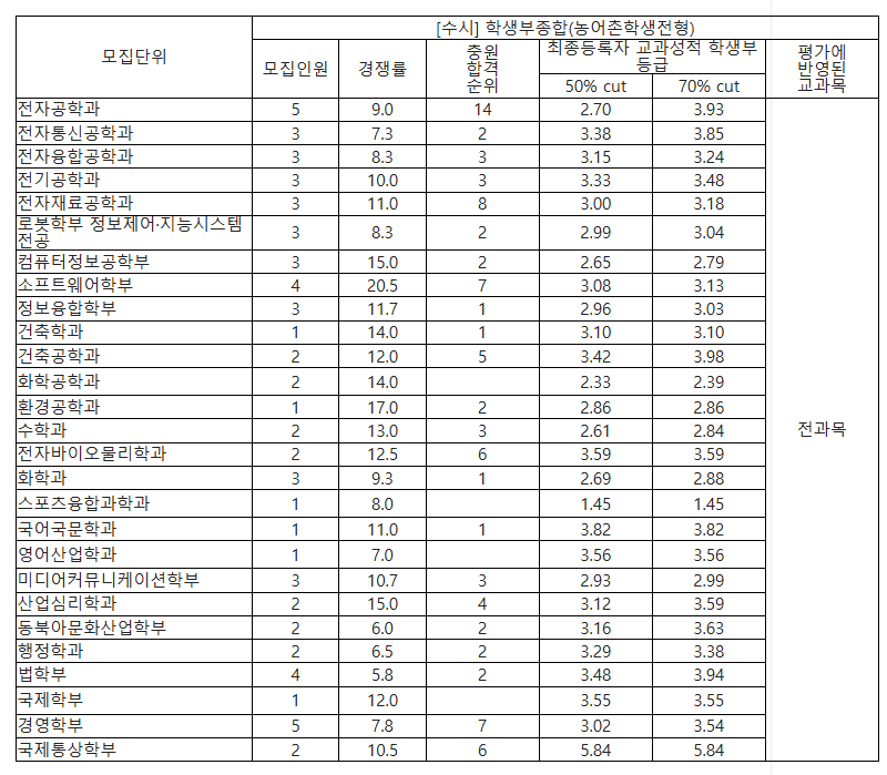 2024학년도 광운대학교 학생부종합 농어촌학생전형 50%컷 70%컷