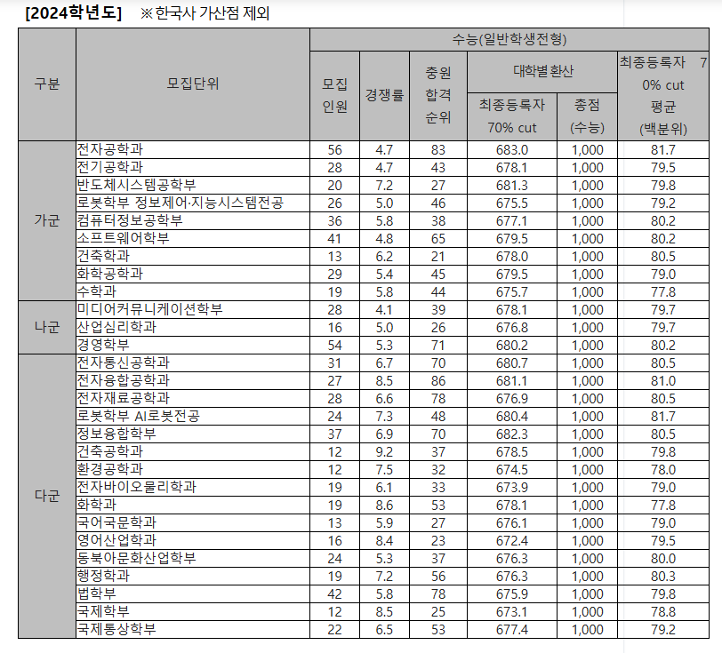 광운대학교 2024학년도 수능 일반학생전형 백분위 70% 컷
