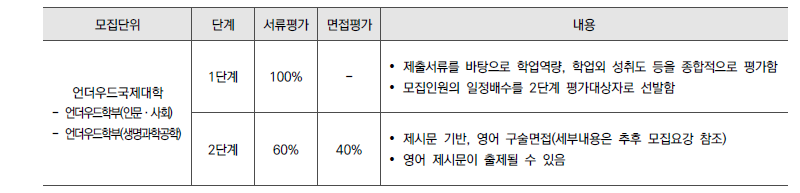 ※ 국내 소재 외국교육기관, 외국인학교, 특별법에 의한 국제학교, 검정고시 출신자가 언더우드학부에 지원하고자 하는 경우에는 학생부종합[국제형]으로 지원해야 함
