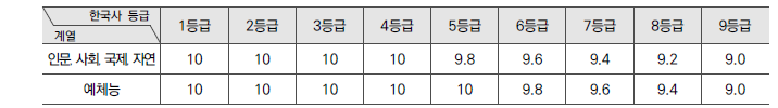 ※ 영어와 한국사는 등급에 대하여 다음의 등급별 점수 또는 등급별 가산점을 반영함