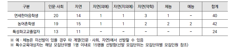 ▶ 연세한마음학생: 수시모집 43명/정시모집 40명 선발