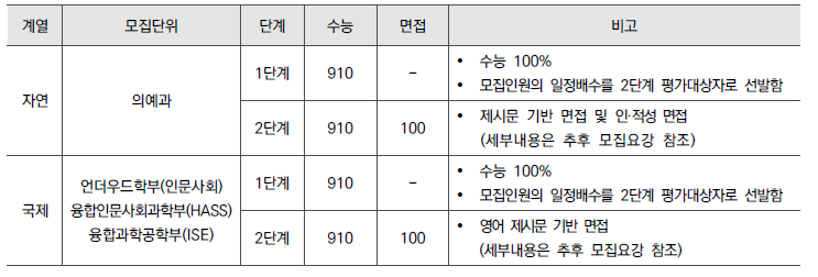 ▶ 의과대학 의예과와 국제계열은 1단계 수능(910점)으로 모집인원의 일정배수를 2단계 평가대상자로 선발 하여 2단계 면접(100점)을 실시한 후 최종 합격자 선발