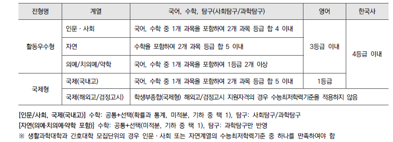 ▶ 학생부종합전형 활동우수형과 국제형(국내고)에 수능최저학력기준을 적용하되, 이전 대비 완화된 기준을 적용하여 수험생의 부담을 최소화하고자 함