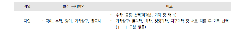 ∙ 자연계열 모집단위별 과학과목 선택: 원서접수 시 모집단위별 지정과목 중 1과목 선택