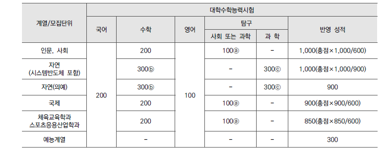 ⓐ 인문, 사회계열, 국제, 체능계열의 탐구영역은 두 과목 표준점수 총점 200점에 1/2을 곱하여 100점 만점으로 반영함