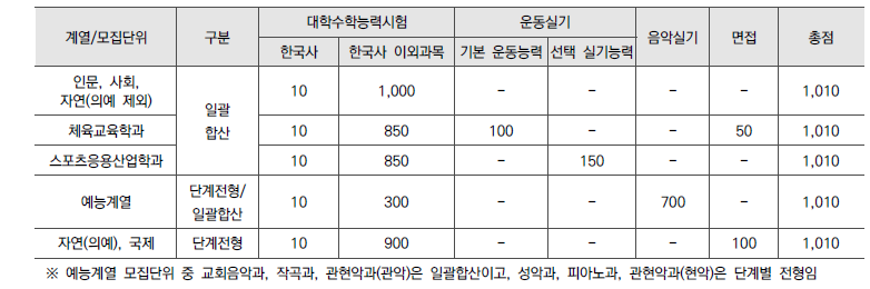 ※ 대학수학능력시험은 표준점수를 사용하여 반영함. 다만, 수능 영역 및 유형별 점수 보정이 필요한 경우에 한하여 대학수학능력 시험 성적표 상의 백분위를 활용하여 우리대학교가 자체적으로 산출한 변환점수를 반영함