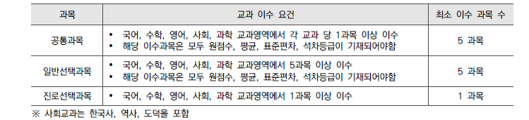- 교과등급 7등급 이내인 과목과 성취도 B이상(3단계 평가) 혹은 보통 이상인 과목과 성취도 D이상(5단계 평가)인 과목의 단위수 합이 해당 이수과목 단위수 합의 25% 이상