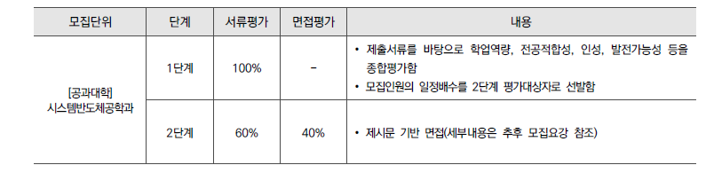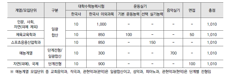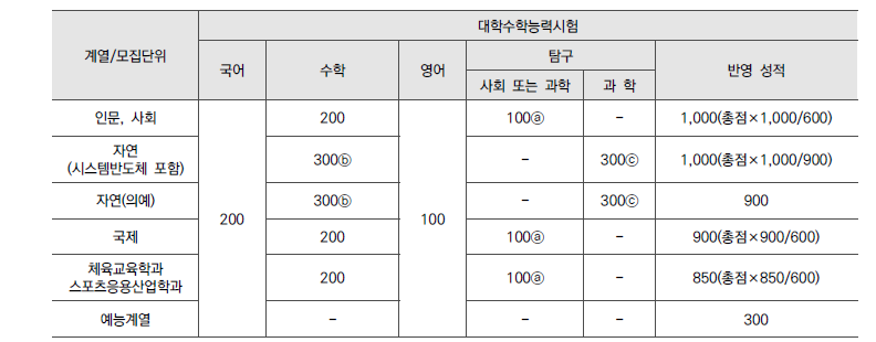 ※ 대학수학능력시험은 표준점수를 사용하여 반영함. 다만, 수능 영역 및 유형별 점수 보정이 필요한 경우에 한하여 대학수학능력